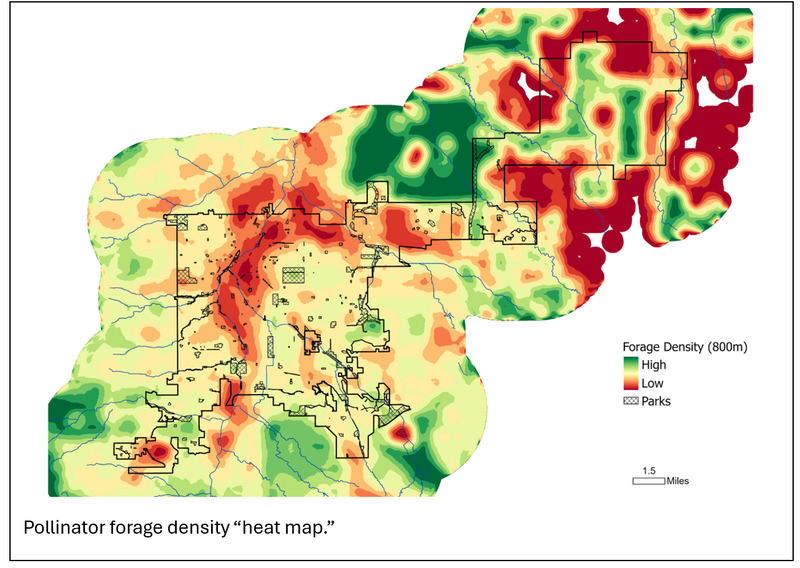 Biohabitats identified focal species, habitat requirements, and movement patterns before conducting a spatial analysis using high-resolution land cover and infrastructure data. Using Omniscape and Circuitscape models and assessing habitat quality and connectivity, the study analyzed the short-range bee species Halictidid (sweat bee) and the long-range bee species Bombus (bumblebee). Data inputs included source areas based on habitat type, patch size, edge condition, movement distances, and adjacent landscape permeability. The resulting analysis positioned DPR to make science-informed decisions regarding green infrastructure, new park/open space acquisitions, restoration, turf conversion, or landscape transformations through the lens of biodiversity and habitat connectivity.
