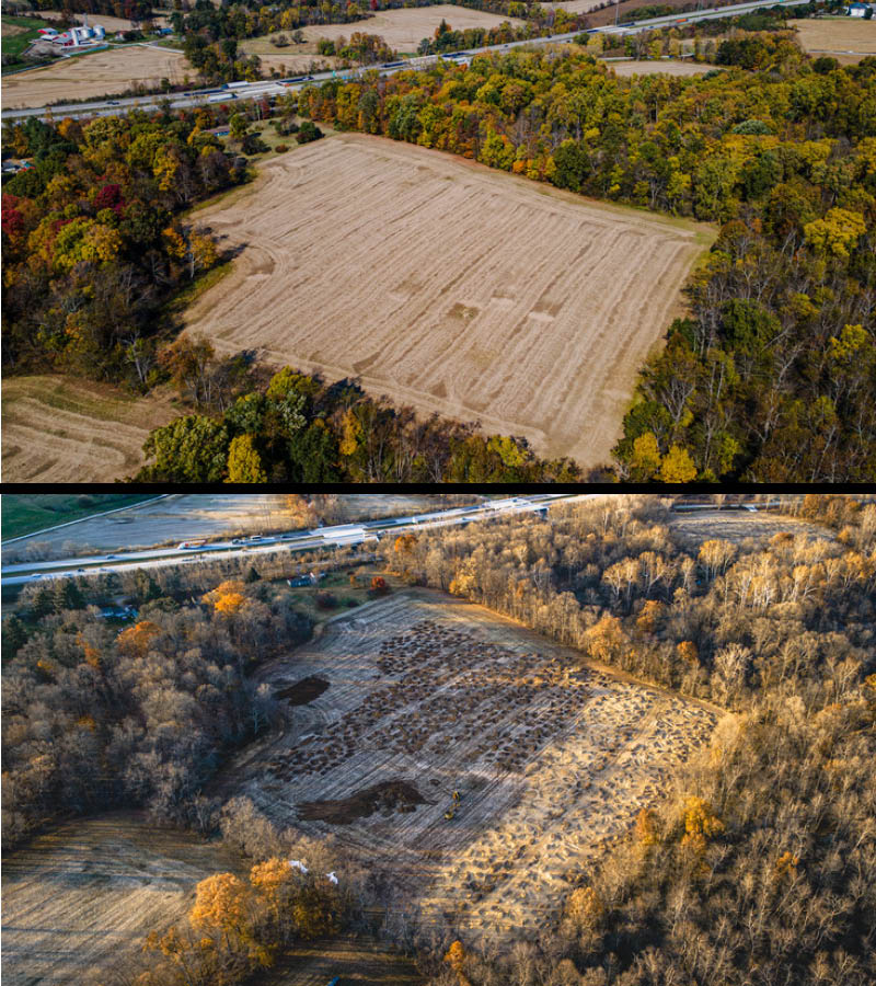 With the goal of transforming 17 acres of the property’s former agricultural fields into riparian forest and wetland habitat, WCC and its partner, the Richland County Park District, turned to Biohabitats for help with design and implementation. Featuring microtopography grading (hummock & hollow and vernal pools), the restoration design restored floodplain function to the Clear Fork Mohican mainstem and tributaries, creating a vegetated buffer to protect the river from adjacent agricultural areas and roads, and re-establishing a mosaic of forested and riparian wetlands.