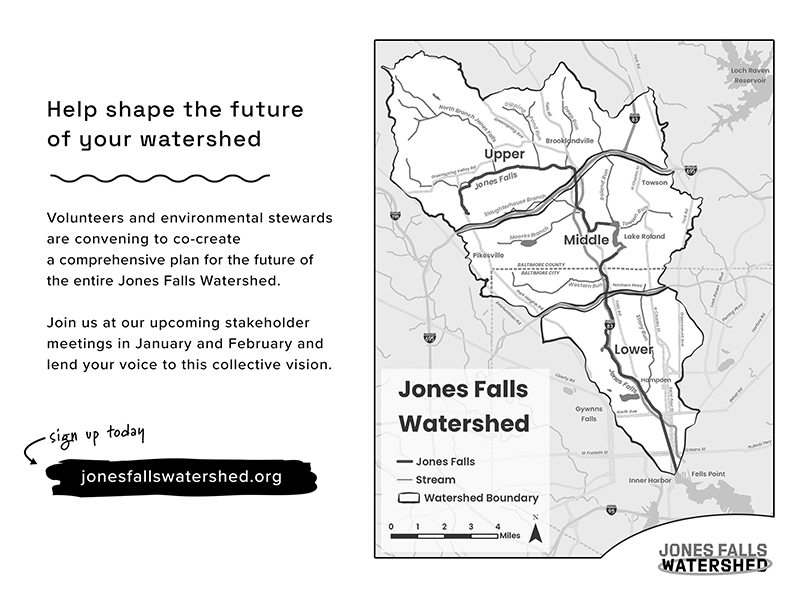 The first round of meetings are geographically focused and we encourage you to attend the session for the area where you live, work, or feel most connected. Visit JonesFallsWatershed.org for more information. We can’t wait to hear your ideas!